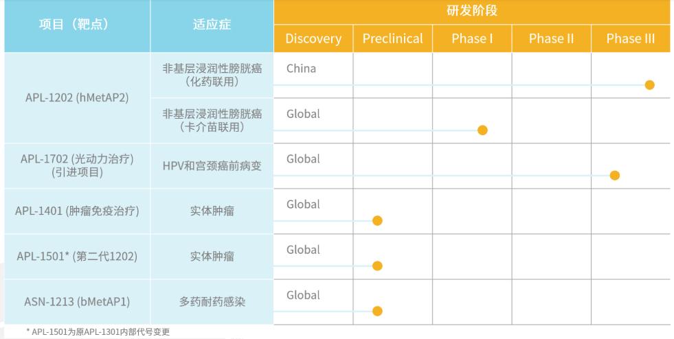 用于治疗非肌层浸润性膀胱癌的产品APL-1202:是国际上第一个进入III期临床研究的口服、可逆的甲硫氨酸氨基肽酶II型(MetAP2)抑制剂。作为新的抗肿瘤机制的口服用药,APL-1202将帮助患者避免或延后膀胱全切的命运。目前APL-1202与化疗灌注联用治疗化疗灌注复发的中高危非肌层浸润性膀胱癌的中国III期临床试验已经完成入组,并准备与免疫治疗药物联用进入中美II期临床试验。上个月,APL-1202单药一线治疗中危性非肌层浸润性膀胱癌的III期临床试验申请在中国获得批准。