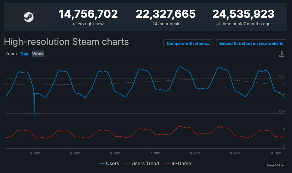在疫情背景下,Steam 平台的同时在线数屡创新高。2月至4月之间,其峰值纪录由1880万一路攀升,最后突破2400万大关。