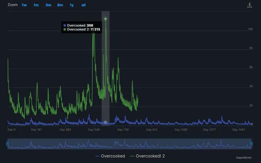 《胡闹厨房》一代、二代的 Steam 同时在线走势