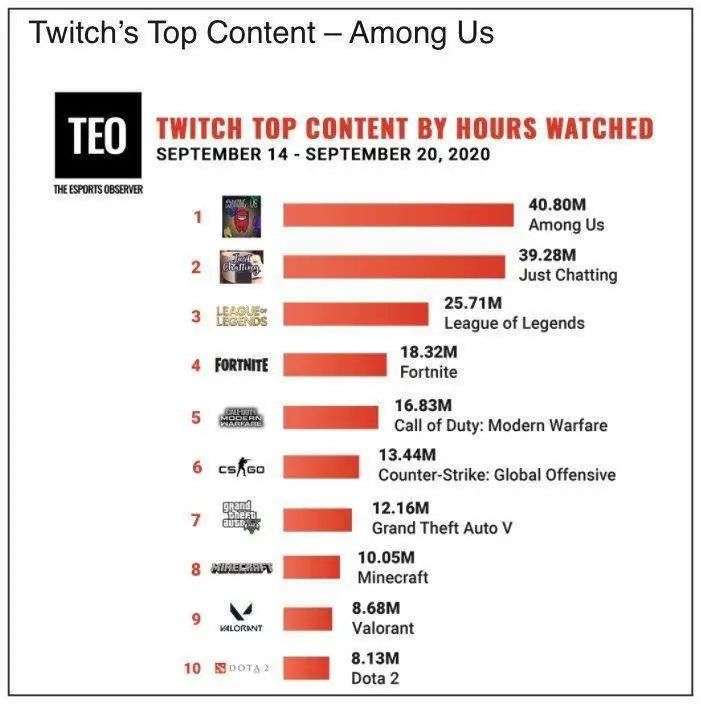 《Among Us》在今年夏天最终迎来了命运的大逆转。越来越多的游戏主播开始播出这款作品。根据 TwitchTracker 的数据显示,在9月14日至9月20日之间,《Among Us》的总观看时长超过了4000万小时,位列全站第一。