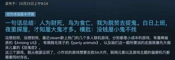 回头来看问题:今年这些独立游戏如何跨过 Steam 同时在线10万门槛?我想,必要条件之一,是这些注重和打磨多人在线体验的游戏,切中了当下玩家的集体诉求。一名 Steam 用户在评价《恐鬼症》时,也留下了类似的观点:「小作坊的游戏想要击败 3A 大作,联网元素以及游戏主题的偏僻技巧都需要同时存在。」