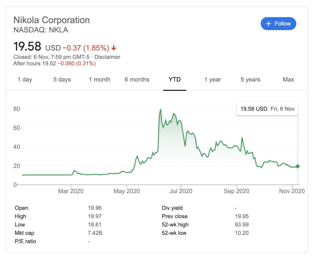 2020年6月,Nikola反向收购VectoIQ Acquisition Corp.上市。挂牌四个多月来,股价几起几落,时而5天暴涨200%,时而一周缩水50%,最高时飙升至93.99美元,成为北美第三大汽车制造厂(仅次于特斯拉和通用汽车),最低时落到17.88美元,不可谓不刺激。