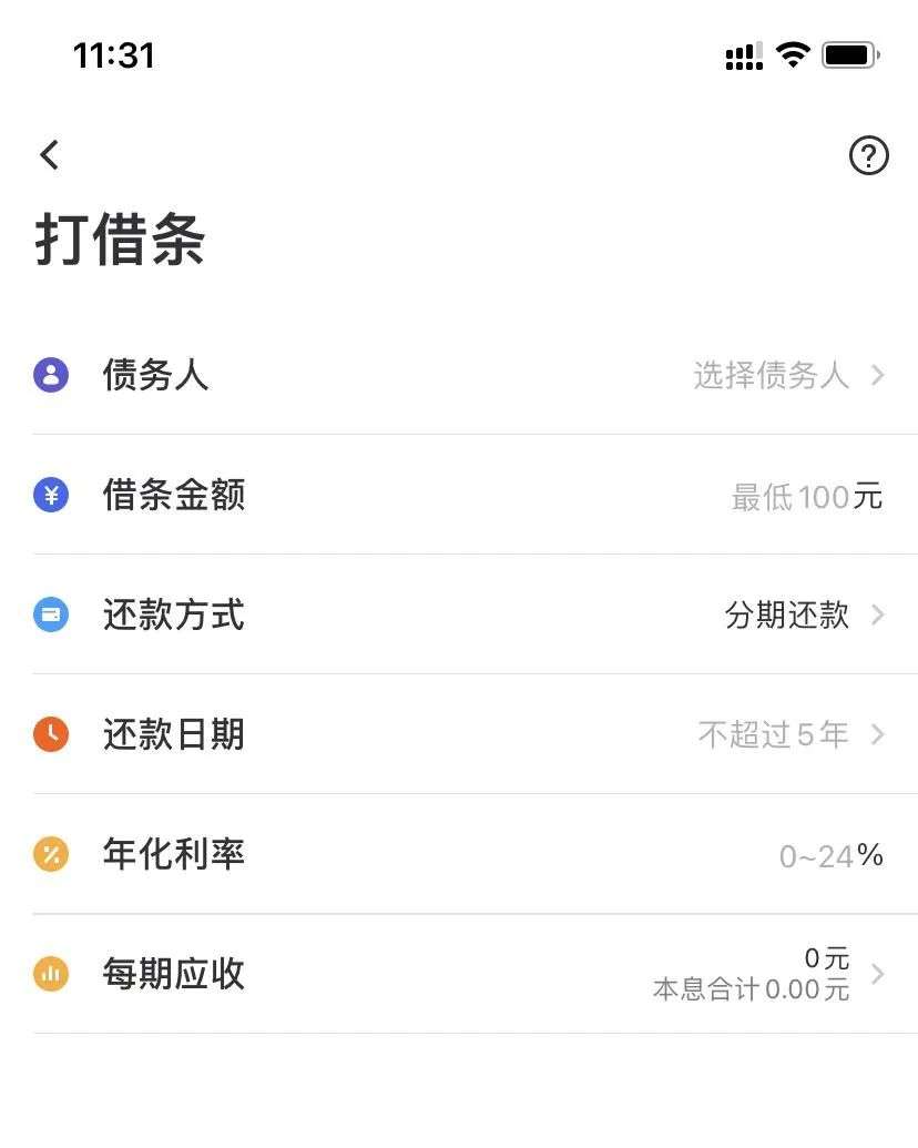 目前,借贷宝APP中主要展示五大功能,分别为:打借条、补欠条、理旧账、亲友投资和员工宝。