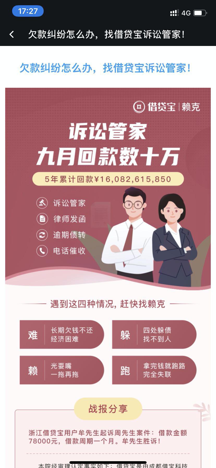 针对债权人、法院和律师三者之间的需求关系,借贷宝设立了专门的子品牌“赖克”,意味着“赖账克星”,通过电话提醒、律师发函、逾期债转等方式解决债权人和债务人之间的纠纷,最后还会以诉讼的终极手段解决问题。