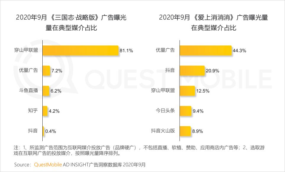 1.2 热门游戏的投放媒介倾向于头条系与腾讯系的广告平台组合