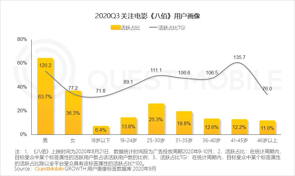 2、热门电影《八佰》,关注用户整体呈现偏男性、中青年的群体特征
