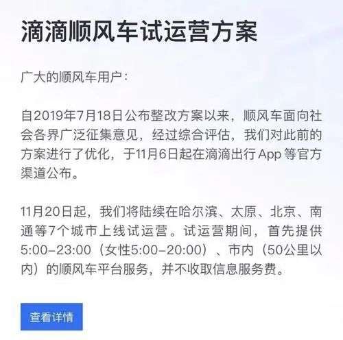 11月6日上午,滴滴顺风车宣布即将上线试运营,试运营期间,将提供5:00-23:00,市内中短途(50公里以内)的服务,但是,为女性乘客服务的时间是5:00-20:00。