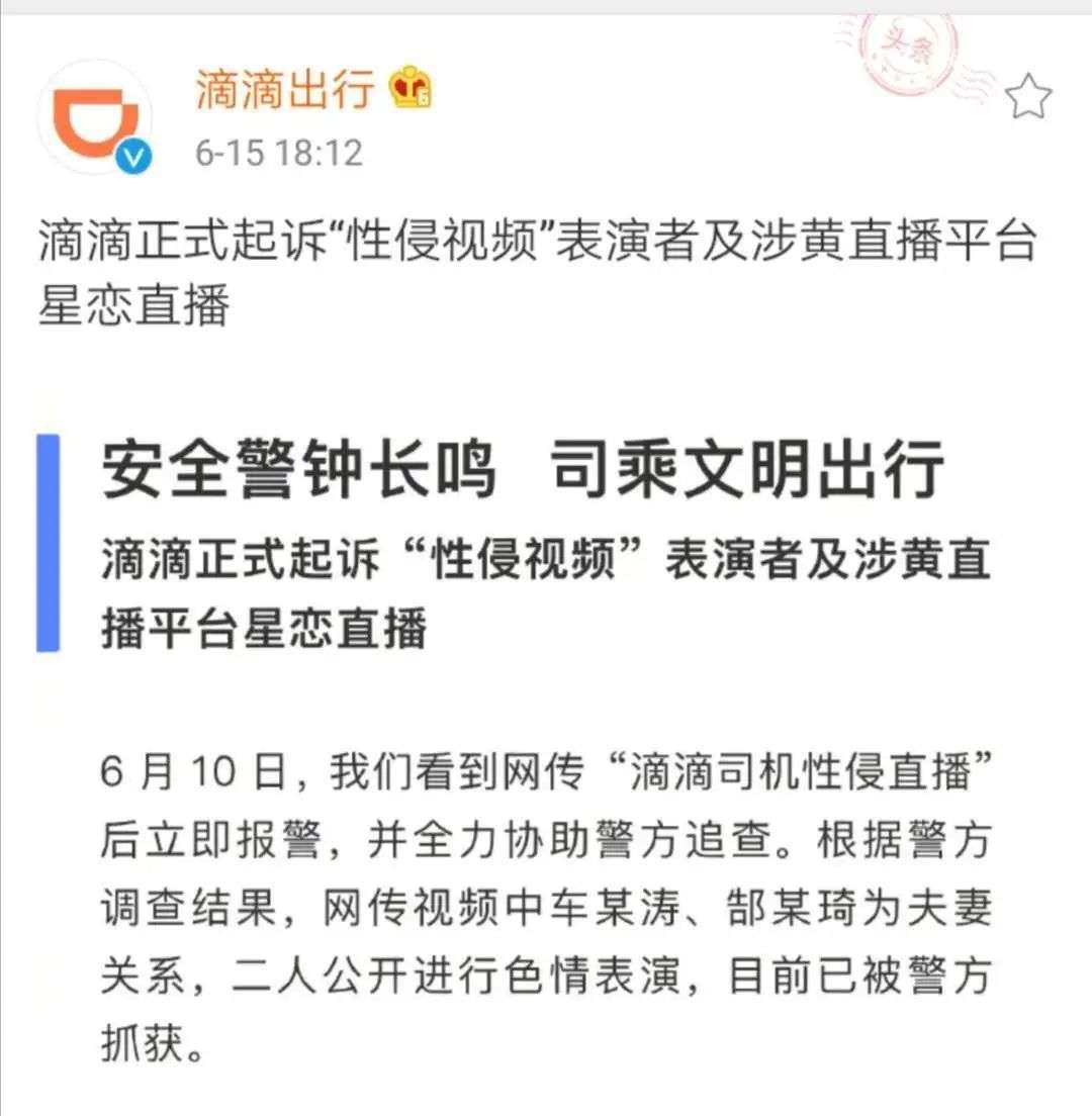 6月11日,有人在社交媒体上爆料:一名自称滴滴司机的男子迷晕女乘客,还直播了性侵过程。此事迅速引发了大众关注,在即将引发新一轮对滴滴安全问题的全民挞伐之际,真相戏剧性反转:原来这起事件中所谓的滴滴司机和女乘客是夫妻关系,两人为了牟利,通过某直播平台,以滴滴司机迷奸女乘客为噱头,进行了一场色情表演。