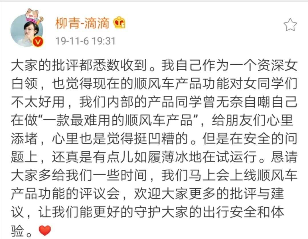 当天晚上19点半,柳青在社交媒体上发声,表示自己“也觉得现在的顺风车产品对女同学不太好用……我们内部产品同学曾无奈自嘲自己在做“一款最难用的顺风车产品”,给朋友们心里添堵,心里也是觉得挺凹槽的”。