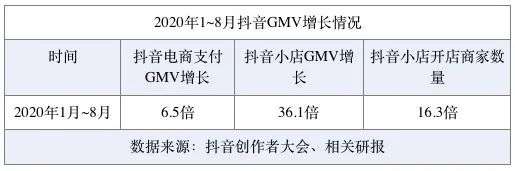 据抖音电商2020年前8个月数据,抖音电商总体GMV增长6.5倍,开店商家的数量增加16.3倍。快手最新披露,2020年8月订单量超过5亿单,仅次于淘宝天猫、京东和拼多多。2020上半年,快手商品交易总额达到人民币1096亿元,成为以商品交易总额计第二大的直播电商平台。