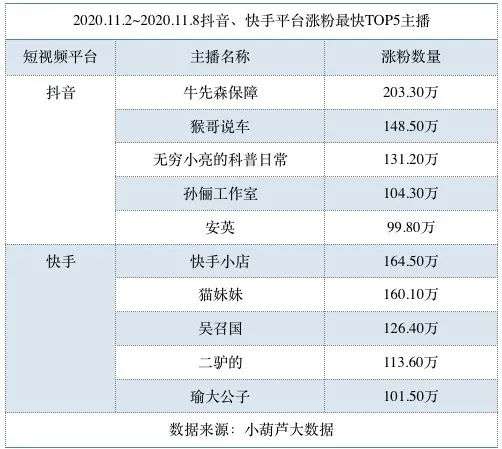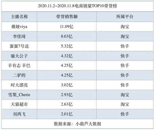 2020.11.2~2020.11.8TOP10带货榜中,快手主播6位,淘宝主播4位