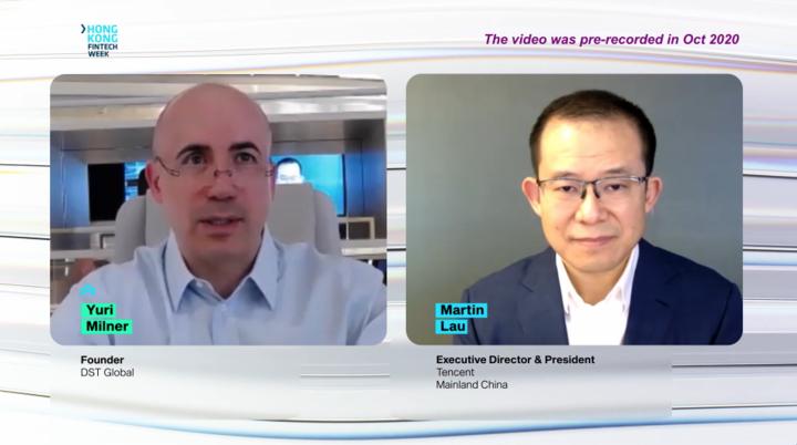 重量级演讲嘉宾包括腾讯公司总裁刘炽平(右)与 DST Global 创始人 Yuri Milner(左)透过在十月预录的影片在香港金融科技周2020(十一月二日至六日)发表见解。