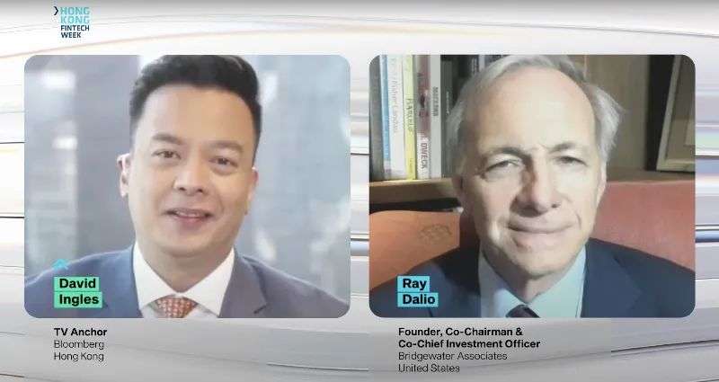 桥水基金创始人、首席投资官 Ray Dalio(右)在香港金融科技周2020(十一月二日至六日)与电视主播 David Ingles(左)分享见解。