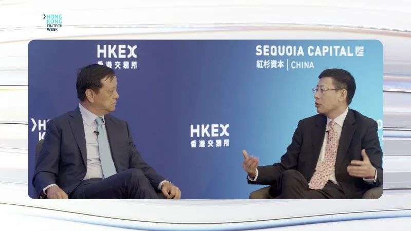 香港交易及结算所行政总裁李小加(左)和红杉资本全球执行合伙人、红杉中国创始及执行合伙人沈南鹏(右)十一月四日在香港金融科技周2020就金融科技议题发表见解。