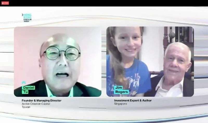 投资专家及作家 Jim Rogers(右)在香港金融科技周2020(十一月二日至六日)与 Active Creation Capital 创始人及董事总经理屠德言(左)分享见解。