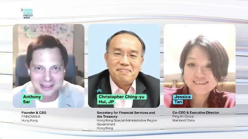 财经事务及库务局局长许正宇(中)十一月二日香港金融科技周2020与平安集团联席首席执行官陈心颖(右)和 Finnovasia 创办人及行政总裁 Anthony Sar(左)的炉边会谈宣布两项新政策措施。