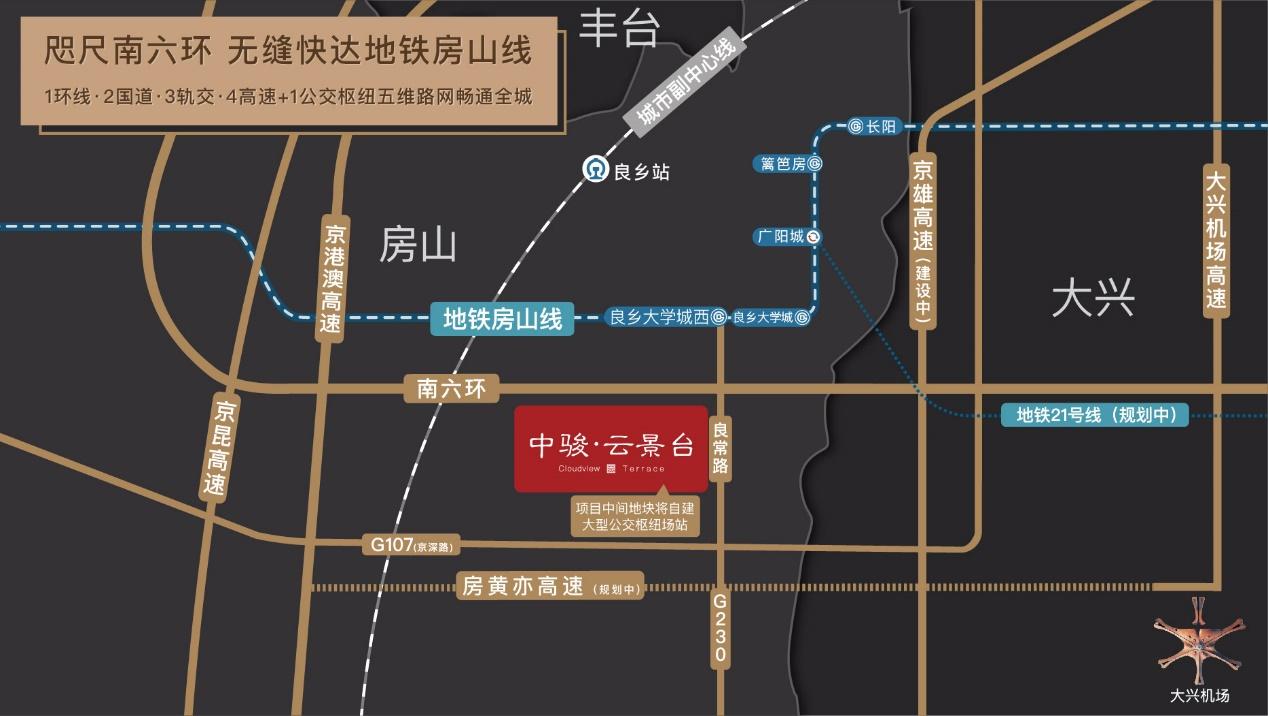 中骏·云景台,位于良乡大学城,与学府比邻而居,从幼儿园直至大学,一应俱全,坐拥“南城海淀式”教育。便捷出行,出门1.5公里直上南六环,自建公交枢纽下楼即乘无缝快速接驳地铁房山线,坐拥1环线、2国道、3轨交、4高速加1座自建公交枢纽五维交通路网,更可立享两座天街、华北最大奥莱等周边百万方商业。