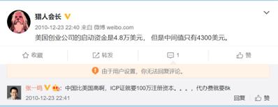 22点41分,张一鸣的评论就出现了:“中国比美国高啊,ICP证就要100万注册资本……代办费就要8k(千)”