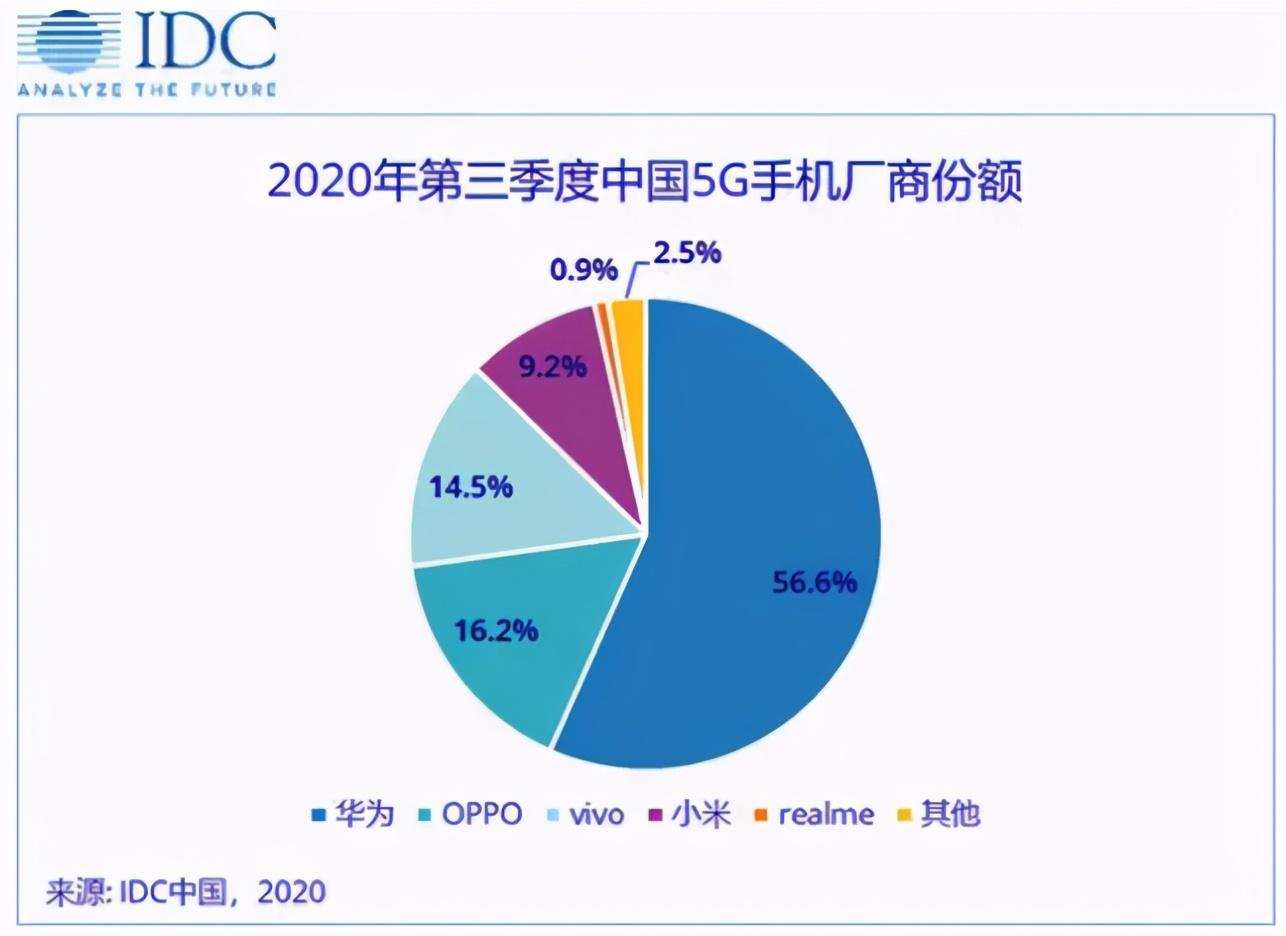 另外,在IDC公布的第三季度中国5G手机市场份额,华为、OPPO、vivo、小米、Realme排名前五。其中华为份额达56.6%超过半边天,小米排在第四位份额仅9.2%。