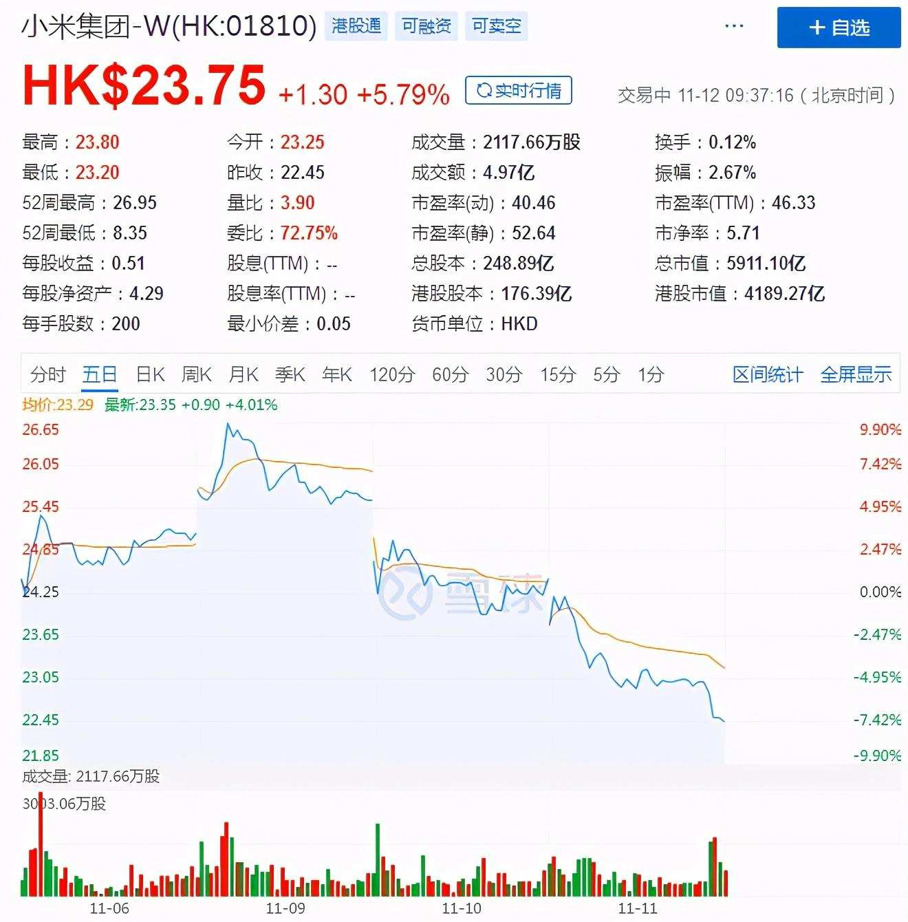 在经过近期股价连续几天的飙升之后,小米也未能逃脱11月10日港股科技股集体下跌的旋涡,当日小米以4.31%的跌幅收盘,次日港股收盘,股价续跌8.18%。截至发稿,股价虽有反弹,但相较于前几日的高点仍下滑明显,这无疑给在三季度手机出货量跻身全球第三的小米泼了一盆冷水。
