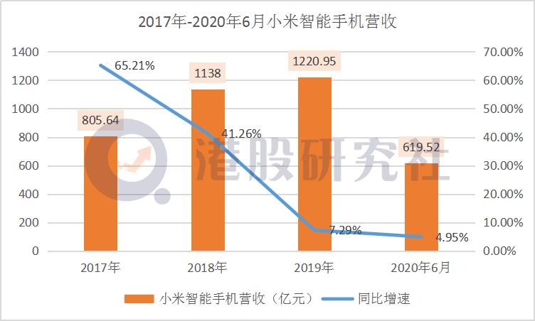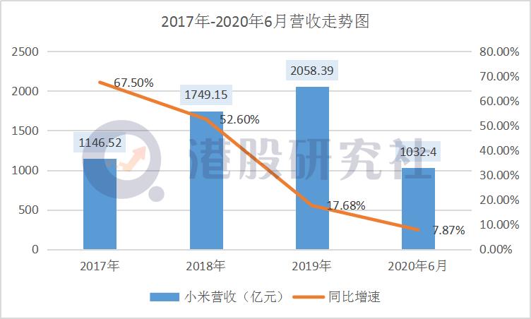 数据显示,2017-2020年6月末,小米营业收入分别为1146.25亿元、1749.15亿元、2058.39亿元和1032.40亿元,同比增速67.50%、52.60%、17.68%和7.87%。