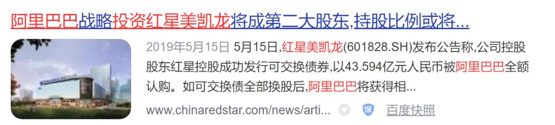 阿里巴巴在去年战略入股了红星美凯龙,大家注意时间,是2019年的5月15日