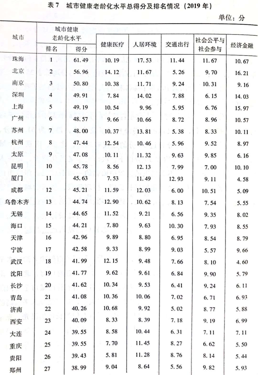 中国城市总体上应对老龄化的能力有限,排名第一的珠海是唯一得分过‘及格线’(60分)的城市。