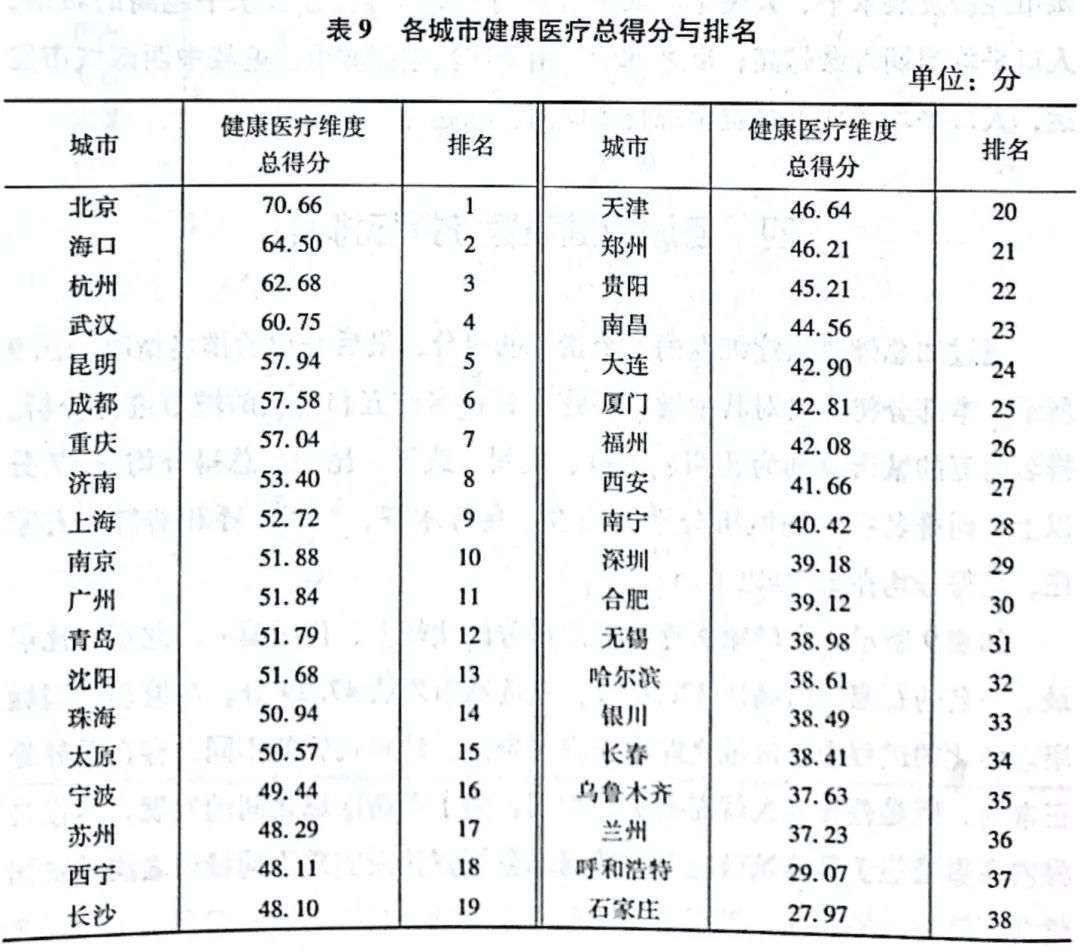 比如,海口、昆明两座城市的健康医疗水平均位于前十,其中海口排名第二,仅次于北京。值得注意的是,海口排名从2017年第9名跃升7名,一方面源于当地候鸟式养老兴起,另一方面也推动了当地政府对健康医疗、养老服务等方面建设的重视。《“健康海口2030”行动计划》提出,要将人均预期寿命提高至82岁。