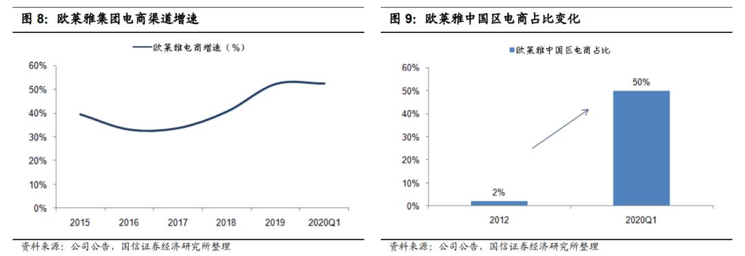 积极布局之下,电商渠道成为欧莱雅增长的强驱动力。欧莱雅集团中国区业务中电商的占比从2012年的仅2%左右提升到了目前的超过50%,在今年疫情的催化之下,2020年第一季度欧莱雅中国区的电商部门营收同比增长67%。