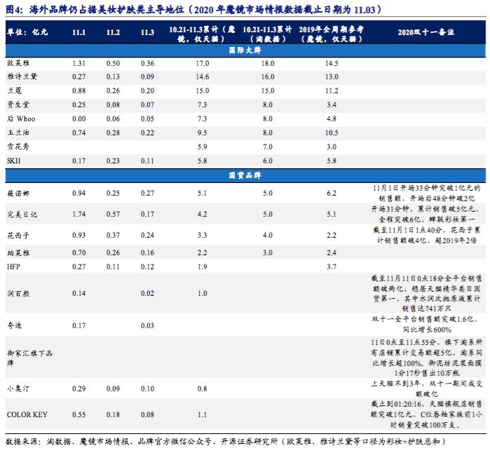 另一大美妆巨头雅诗兰黛亦不甘落后,2019年双十一雅诗兰黛预售25分钟实现交易额近5亿元,等于去年双十一全天成交量;首日交易额达5.87亿元,预售期间成交额排在美妆护肤类首位。其大单品雅诗兰黛小棕瓶眼霜预定超55万套,预售额达2.9亿元,个护类单品预售额排名第一。
