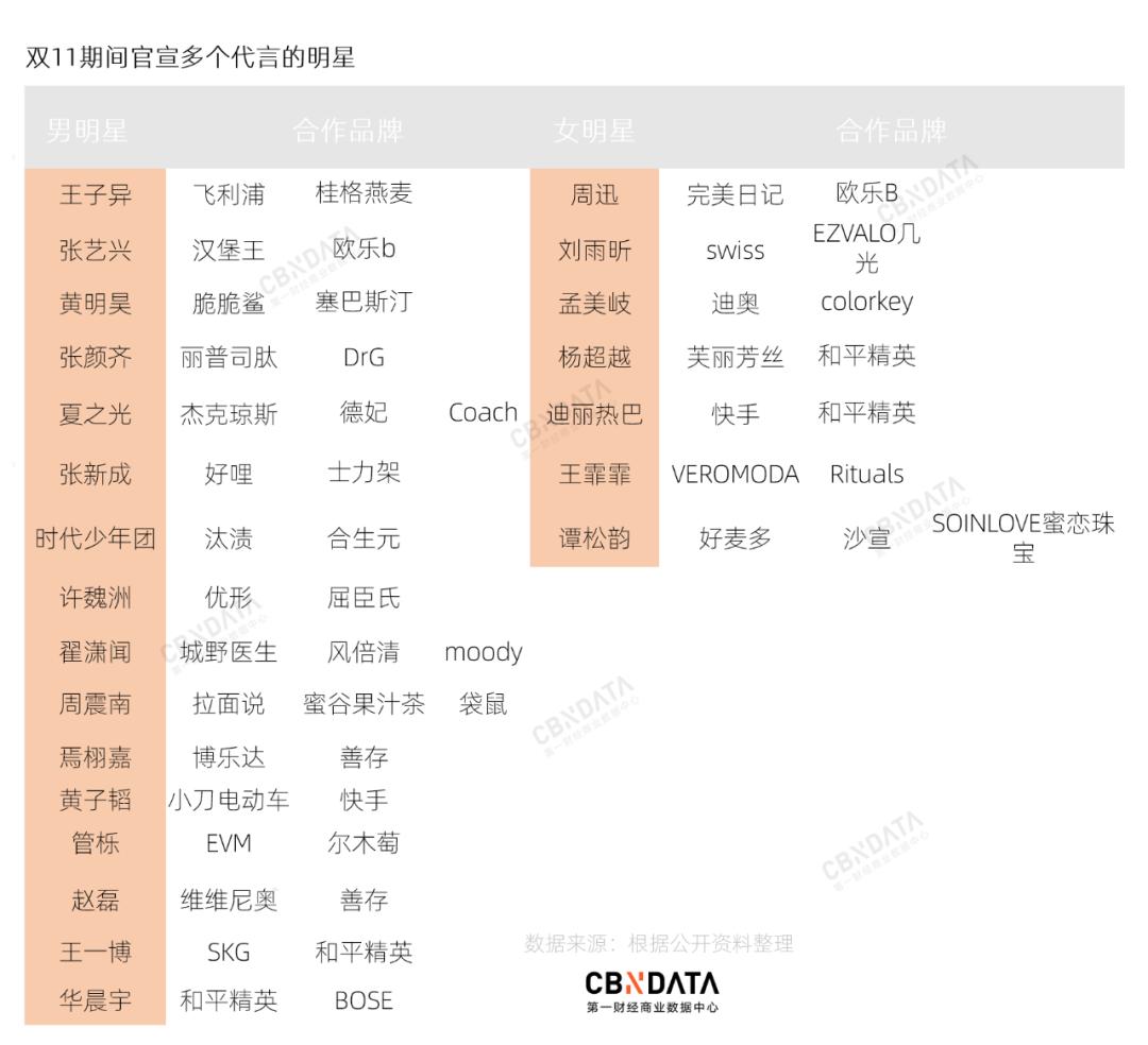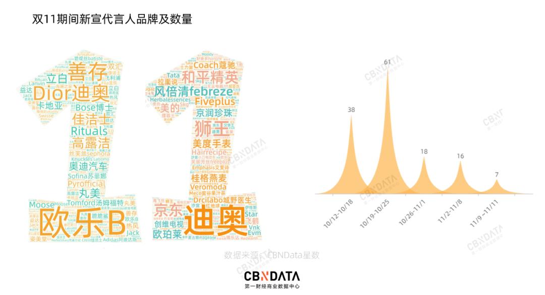 据CBNData消费站(以下简称C站)不完全统计,双11前后,超过100个品牌选择了新代言人,其中益达、迪奥、欧乐b等少量品牌选择两位及以上的明星进行合作。