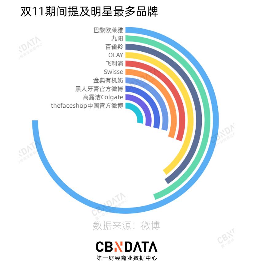 选完代言人后,一大波宣发便找到了落脚点。作为目前最大的流量池,微博这一渠道成为品牌向外界公开和玩转营销活动的主要窗口。C站统计了双11期间所有品牌提及明星的微博数据发现,巴黎欧莱雅和九阳提及明星的次数最多。