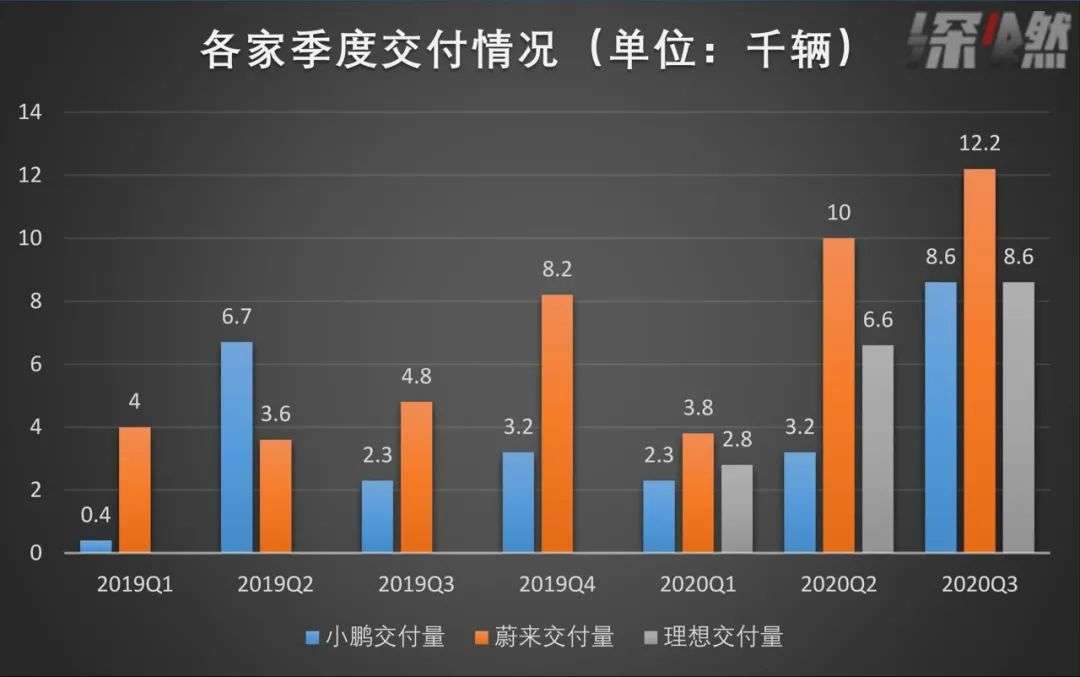 自从三家造车新势力都上市以来,由于有上市的信用背书,各家销量不断水涨船高。2020年三季度,蔚来交付了1.2万辆,连续两个季度交付量破万;理想也交出了8660辆,这个成绩对于只有一款车型且去年12月份刚刚量产的公司来说,实属瞩目。
