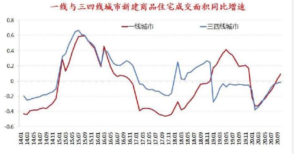 从成交量便可看出来,2017和2018年,三四线城市的新房成交比强于一线,但是2019年后,一线城市明显超过了三四线。