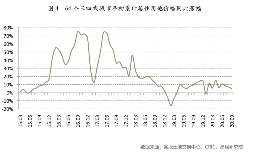 从大周期看,三四线城市地价已经没有了2016-2017年的疯狂状态。
