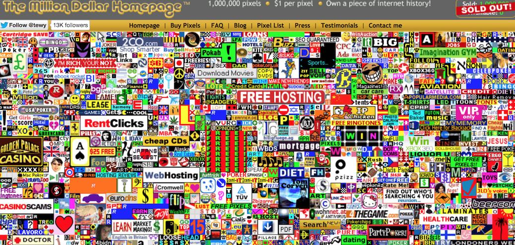 他的想法很简单。他创建了一个网站——milliondollarhomepage.com。网站主页由一百万个像素组成,整齐地排列在1000×1000像素的网格中。Alex把网站主页划分为很多个10x10像素大小的区块来销售,买了这些像素块的公司就可以在上面打广告。