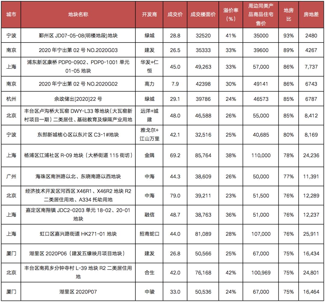 典型如绿城摘得的宁波鄞州区JD07-05-08(明楼地段)地王项目,该地块楼板价达到32520元/平方米,而周边在售的建邦·璟誉府均价为35000元/平方米,地房比高达93%,房地差仅有2480元/平方米。