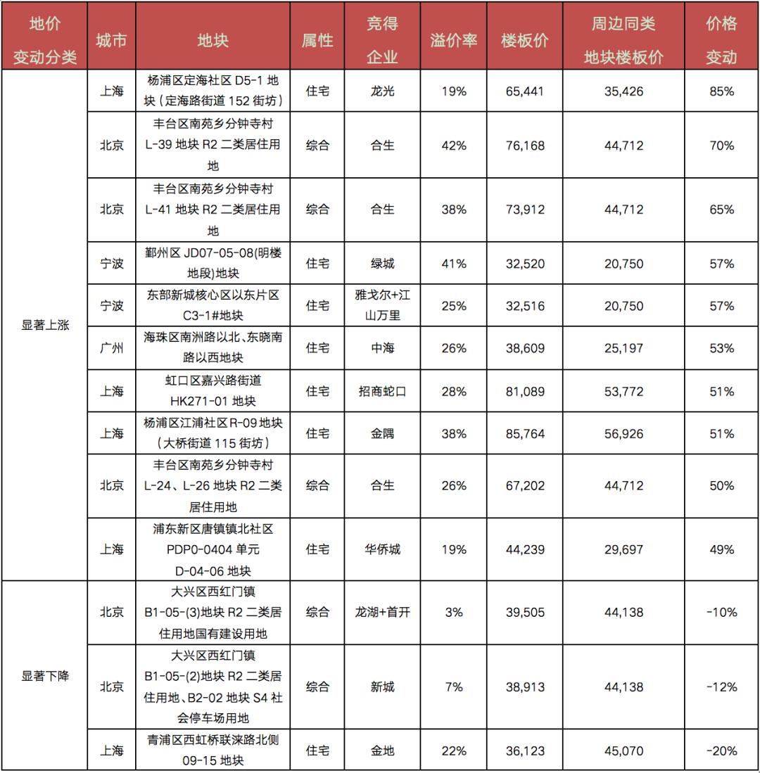 TOP50高价地中,仅有3幅地楼板价较周边同类地块价格下降,降幅均在20%以内。