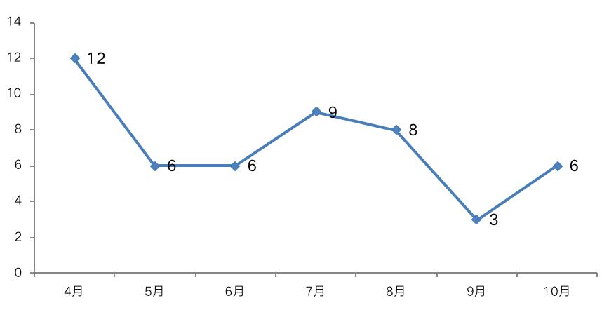 就楼板价TOP50地块月度成交分布来看,在4月达到12幅的高峰值之后,5、6月高地价数量逐渐减少。