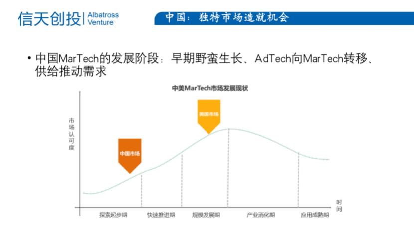 与相对成熟的美国MarTech市场相比,中国目前还处于野蛮生长的早期探索阶段,由AdTech向MarTech转移,供给推动需求。