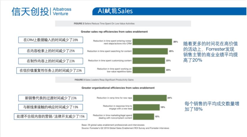 第一,AI赋能Sales,从上图中我们可以清晰的看到AI赋能的效果。AI赋能有一定门槛,一是和底层的平台例如CDP、CRM的集成能力;二是AI的能力,比如对文本语音进行识别和分析、对话机器人、知识图谱等;三是对销售行业的理解。
