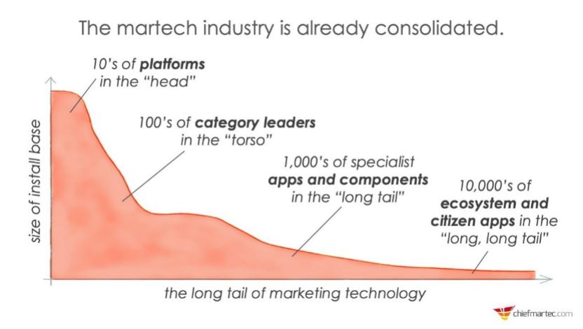 原因有三:第一,营销和互动方式一直在变化;第二,营销知识和技术迭代越来越快;第三,云计算让创业门槛降低。所以MarTech大趋势一定是马太+长尾,头部越来越强、尾部越来越多。
