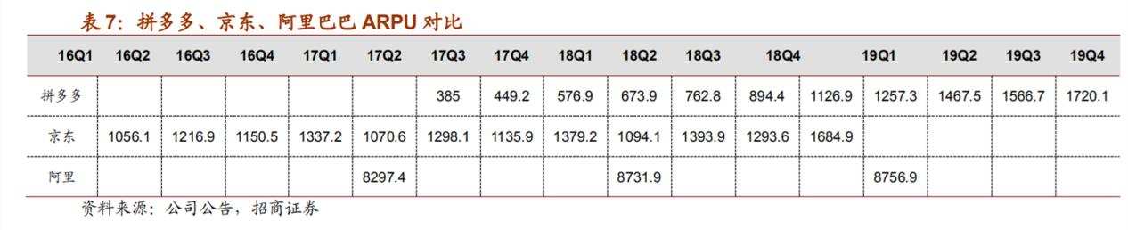 除了在该数据面临同比下滑,拼多多让部分投资者担忧的一个地方是:其单用户客单价低于京东和阿里。近几个季度,因阿里跟京东都未对外公布平台的GMV,但通过此前招商证券的研报来看,我们也能看到拼多多与阿里、京东在ARPU值上的差距不小。