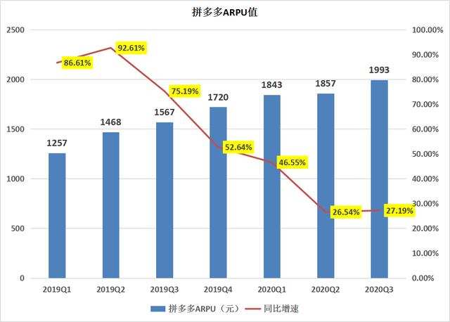 虽说拼多多年度活跃买家达到7.313亿,但亮眼的用户增长却未能驱动拼多多GMV实现更高增长。在业内人士看来,这主要受拼多多ARPU值提升有限影响。在本季度,拼多多的ARPU值为1993元,同比增加27.19%。