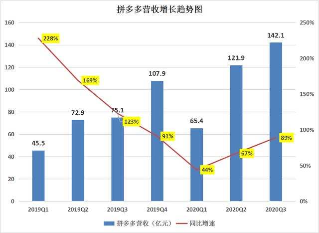 首先从营收来看,本季度拼多多营收142.1亿元,同比增长89.11%;非美国通用会计准则(NON-GAAP)下,实现净利润4.664亿元,首次实现季度盈利。随着国内疫情向好,增速也环比回升,从今年发布的三个季度财报来看,拼多多营收增速在回涨。