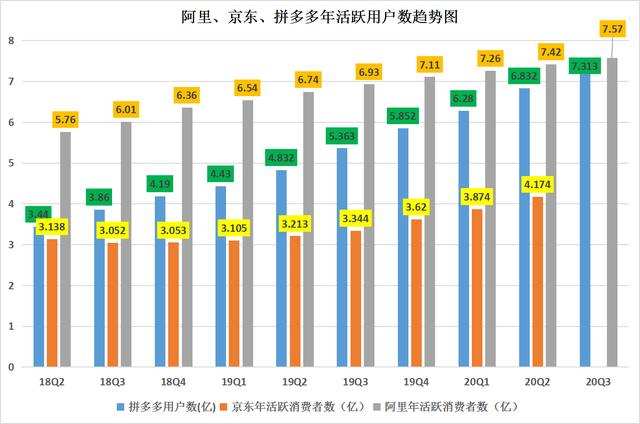 对于投资者而言,电商平台的用户规模跟用户增速是衡量公司价值的关键。根据阿里、京东、拼多多披露的年底活跃用户来看,分别是7.57亿、7.313亿、4.174亿。