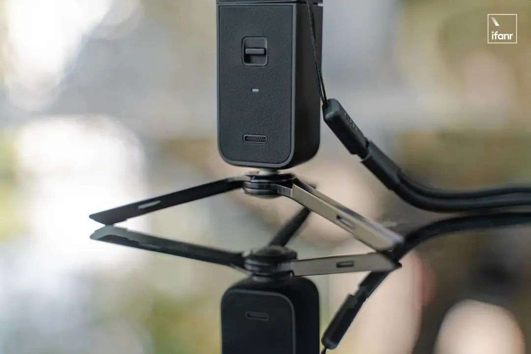 有了全能手柄,Pocket 2 便可通过 WiFi 与手机相连,Pocket 不再需要与手机贴身零距离绑定,可以给前者装上微型三脚架,放于平面,用手机远程遥控着,把 Pocket 2 作为一个固定机位去使用,让 Vlog 的视角更加丰富。