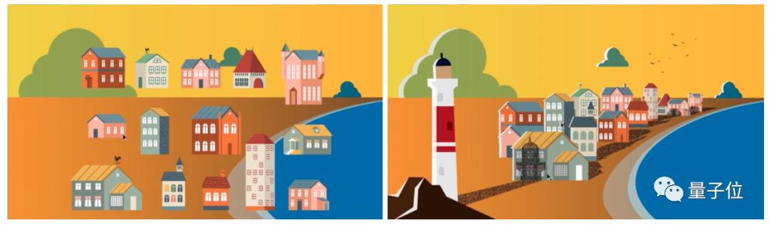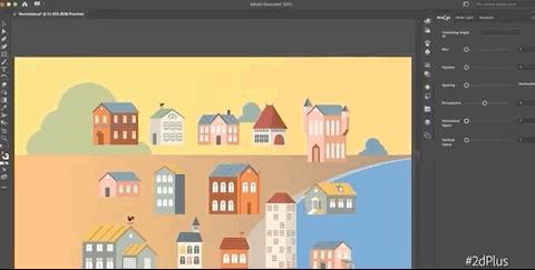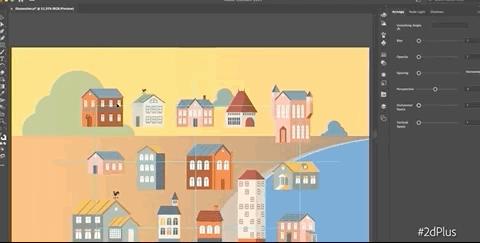 别生气,Adobe双手给你奉上了超级矢量图工具2D Plus,无论是将房子聚拢/分散、沿海岸线形状透视、还是加上高光阴影,鼠标就能P图: