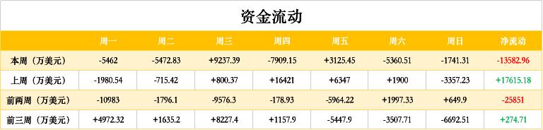 资金方面,上周最大净流入接近 1 亿美元(周三),最大净流出接近 8000 万美元,并且有五天时间资金都呈现流出状态,获利盘开始套现。