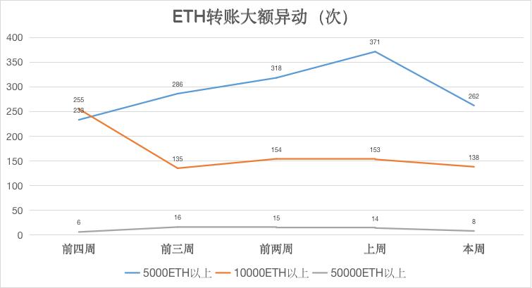Tokenview数据显示,链上转账次数上周小幅上涨,“5 千 ETH 以上”、“1 万 ETH 以上”以及“5 万 ETH 以上”大额转账次数环比下降 29.38%、9.8%、42.86%,巨鲸账户异动频次大幅降低。